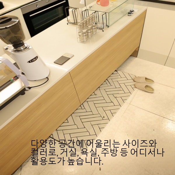 ● 실내 사용에 최적화된 매트로, 미끄럼 방지 기능이 뛰어나 안전하게 사용할 수 있습니다. ● 내구성이 뛰어난 소재를 사용하여 오랜 시간 변형 없이 깔끔하게 유지됩니다. ● 부드러운 촉감과 세련된 디자인으로 집안 분위기를 한층 더 고급스럽게 연출합니다. ● 물이나 오염에 강해 간편하게 세척할 수 있어 항상 청결하게 사용할 수 있습니다. ● 다양한 공간에 어울리는 사이즈와 컬러로, 거실, 욕실, 주방 등 어디서나 활용도가 높습니다.